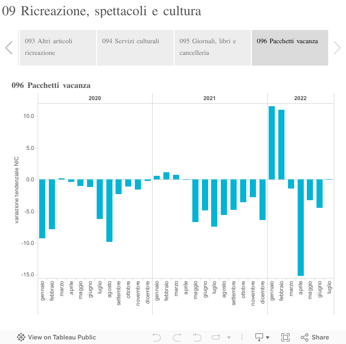 Gli indici che per questi motivi hanno avuto una quota di imputazioni superiore al 50% sono in marzo 2020 "Pacchetti vacanza", in aprile 2020 "Altri articoli e attrezzature per attività ricreative, giardinaggio e animalii" e "Pacchetti vacanza", in maggio 2020 "Servizi ricreativi e culturali" e "Pacchetti vacanza" e in Giugno 2020 "Pacchetti vacanza". Dopo un periodo di riapertura dei servizi, nei mesi di novembre e dicembre 2020 e gennaio 2021 hanno avuto una quota di imputazioni superiore al 50% gli indici dei "Servizi ricreativi e culturali" e "Pacchetti vacanza", nei mesi da febbraio a luglio 2021 gli indici dei "Pacchetti vacanza" .